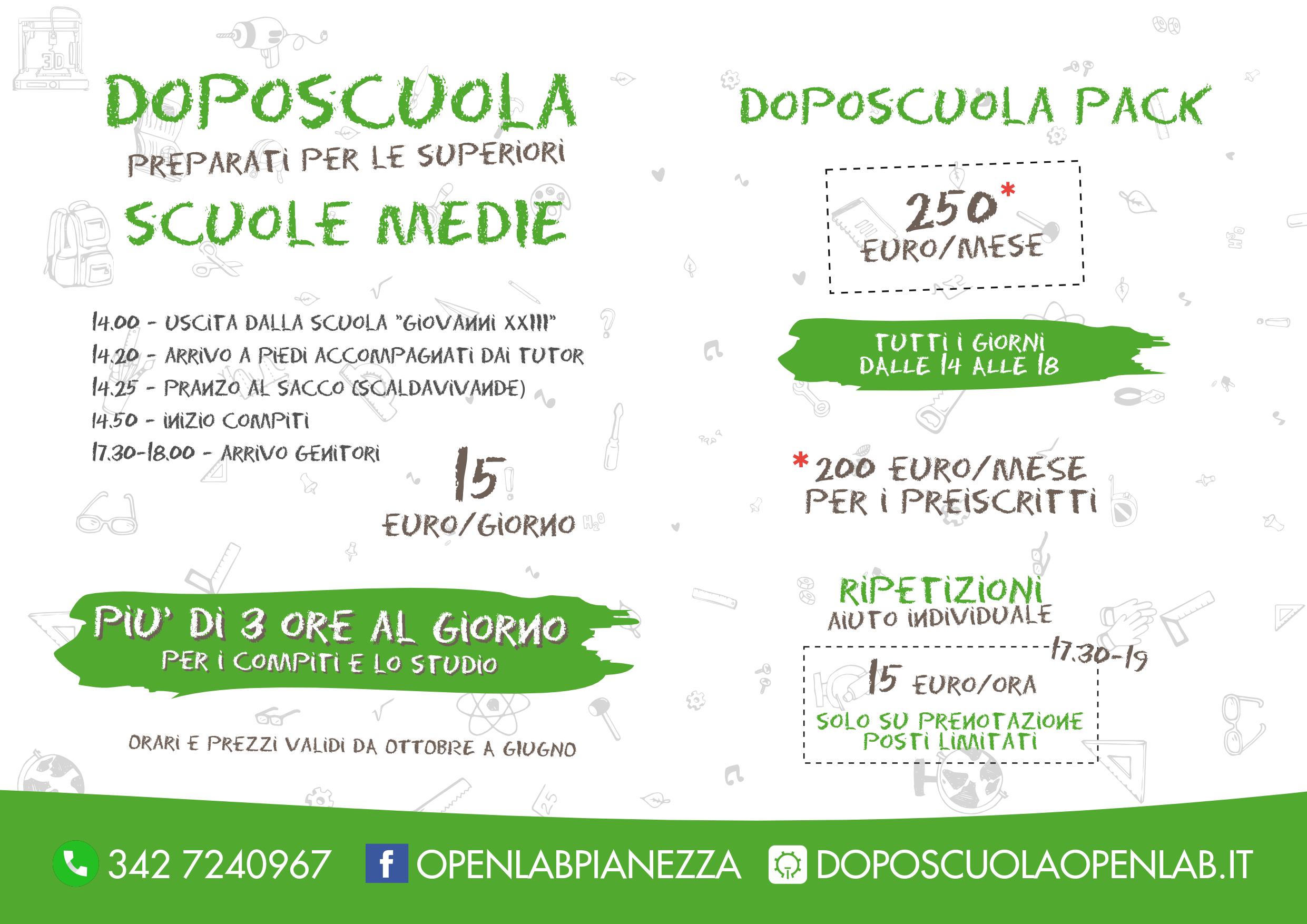 Il Doposcuola è il servizio dedicato alle scuole medie, ci permette di affrontare più materie in modo completo e, sul lungo periodo, aiutare i ragazzi ad essere pronti alla mole di lavoro delle scuole Superiori. Consigliamo tra le 3 e le 5 presenze alla settimana per garantire ai ragazzi di imparare a gestire il lavoro (senza finire i compiti la sera) ed avere il weekend libero.