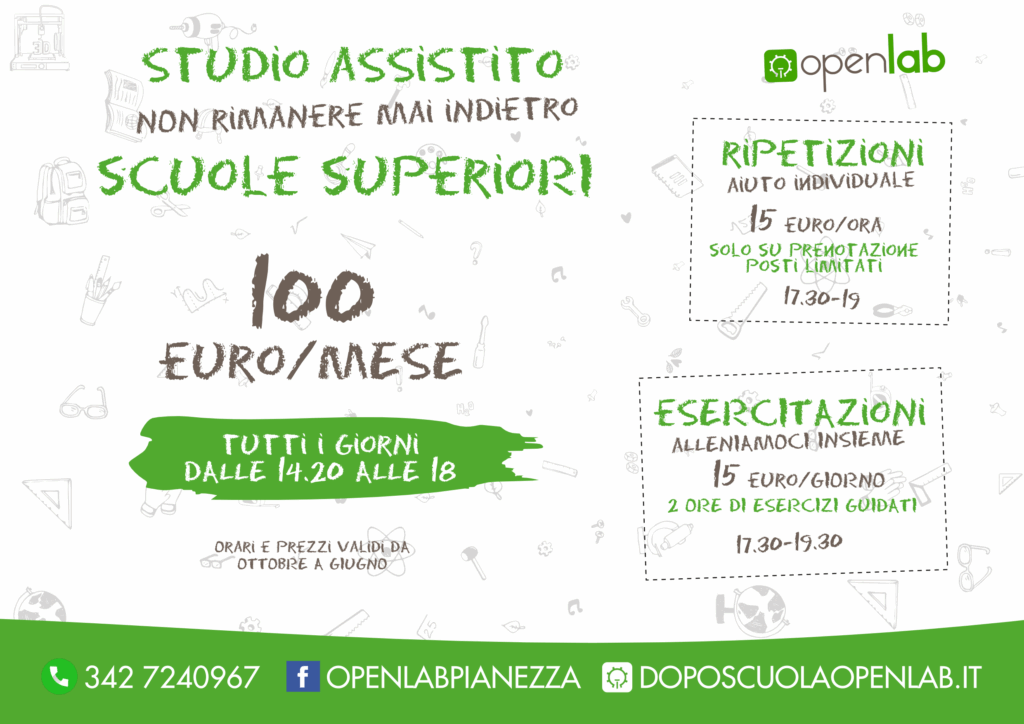 Il nostro studio assistito è dedicato ai ragazzi della scuola superiore ed è attivo per tutti gli indirizzi di studio. Lavorare sull’organizzazione dei compiti in modo continuativo aiuta ad affrontare al meglio anche materie completamente nuove. Per questo motivo abbiamo pensato ad un prezzo fisso mensile per stimolare una presenza costante.